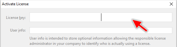Each license key consists of 25 signs grouped in 5 x 5 sign groups. The keys are unique and they serve as references to concrete license data stored on our servers. Consequently, the key itself does not contain any concrete license information. Depending on individual license parameters the key can be shared between multiple users (so-called floating license) or it will be locked to one machine. One license key can also cover multiple seats - according to the license model you have purchased. To enter the license key please use the edit field in the upper area of the Activate License dialog: