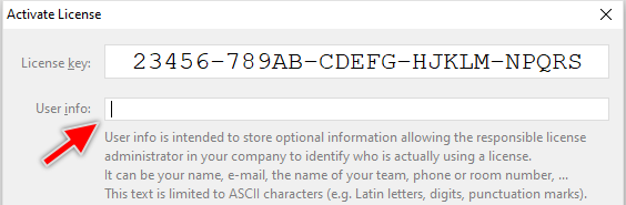 The user info is a short string identifying you within your company or team. It is useful especially when you share the license key with several work colleagues or you install Embedded Wizard on multiple machines. In such cases it helps to identify who in your team is actually using a license. This information is optional. To enter the user info please use the edit field just below the license key: