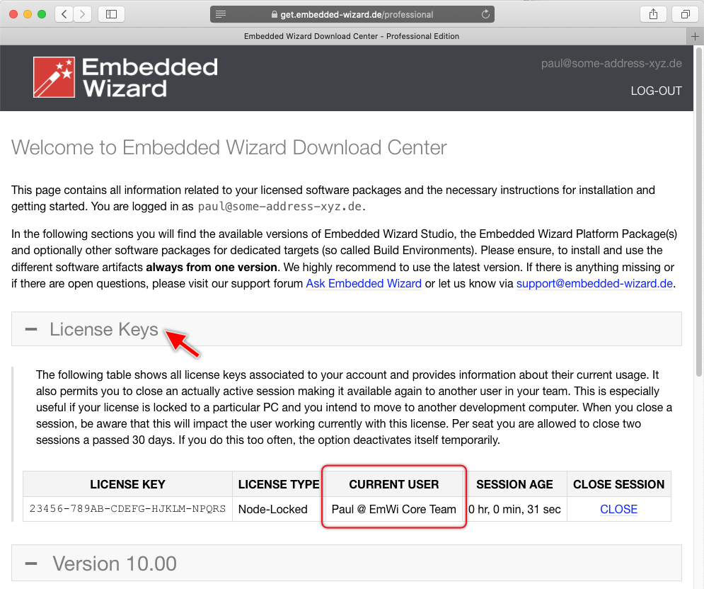 The information you enter in this field will be transferred to our license servers each time you start Embedded Wizard. When you (or dedicated license administrator in your company) log-in to the get.embedded-wizard.de download center, the person can see the user infos for all actively used Embedded Wizard licenses within your company. This information appears in the download center just below the section License Keys: