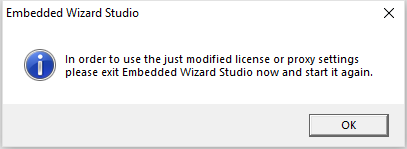Once you have entered the license key and optionally the user info and proxy server configuration, please click on the button to store the data. Thereupon Embedded Wizard will ask you to restart the application in order to use the new license information. Please follow the steps and restart Embedded Wizard Studio now: