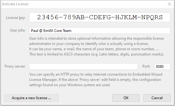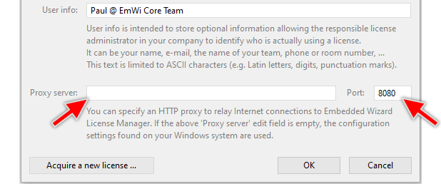 The proxy server configuration is optional. If you leave the above fields empty, Embedded Wizard uses the default parameters as configured on your Windows machine.