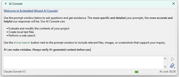 The AI Console integrates an AI assistant directly into Embedded Wizard Studio, enabling you to interact with an intelligent helper that can access documentation, analyze your project, and modify project contents according to your instructions. The AI assistant is powered by Anthropic's Claude models and provides context-aware assistance for GUI development tasks.
