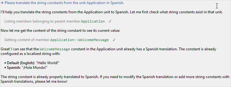 When the AI uses these tools, dedicated entries appear in the chat history showing which tools were invoked and whether the operations succeeded. This transparency allows you to understand how the AI is working to accomplish your request.