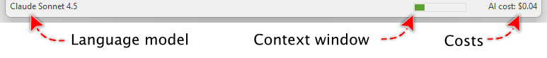 ★Status bar - At the bottom of the window, the status bar displays the currently selected language model, estimated context window size, and accumulated costs for the conversation.