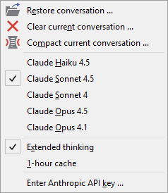 The AI Console provides a context menu with various commands for managing your conversation and settings: