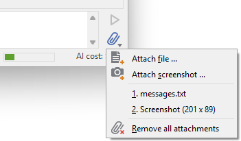 Attachments are particularly useful when you want the AI to analyze specific code files, understand error messages from screenshots, or work with visual design references.