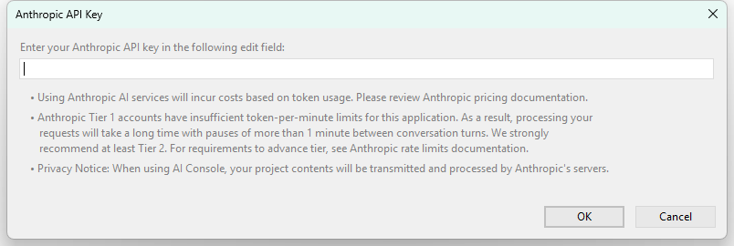 Dialog window for entering Anthropic API key