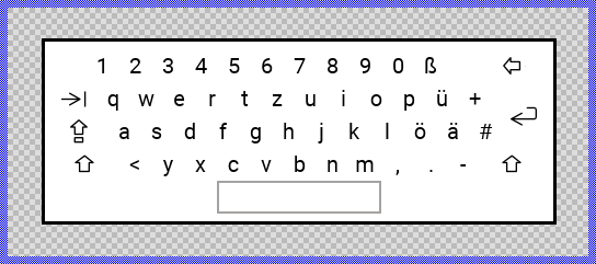 Originally, if not yet modified, the Alphanumeric Keyboard appears displaying a QWERTZ-layout grid with letter, digit, and special character keys as text views, and special function keys (Tab, Caps Lock, Shift, Clear, Enter) as image views. The space bar is indicated by a border rectangle. A white background is surrounded by a border. When a key is pressed, it is highlighted with a red rectangle. When Shift or Caps Lock keys are active, they are indicated with red borders. Our intention is to keep the component templates as minimalistic as possible so they don't distract you with less important design details. The keyboard can react to touch inputs and provides visual feedback with a flash effect for quick taps.