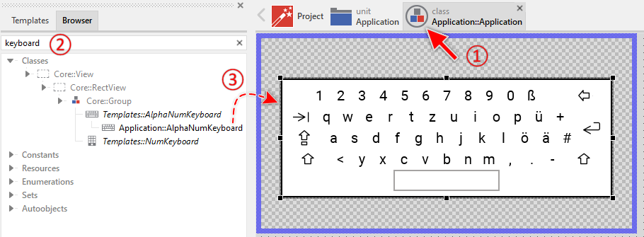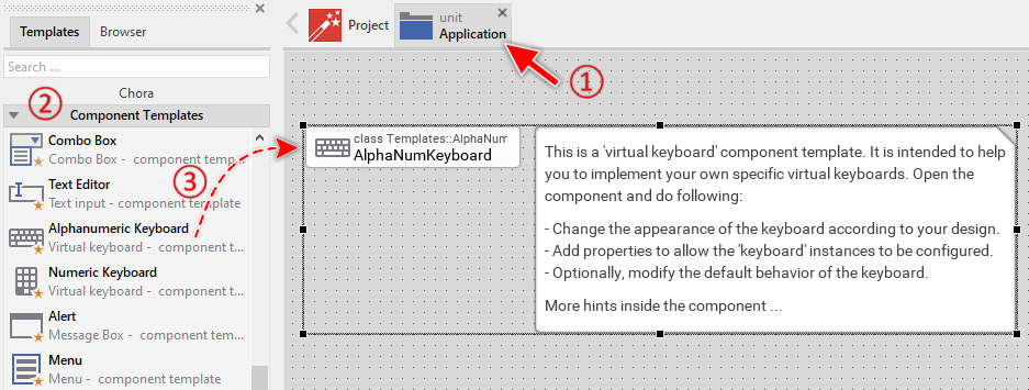 To create a new Alphanumeric Keyboard component from a template you simply Drag & Drop it between the Templates window and the Composer with an opened unit. This is important in that by using the component templates you add in fact a new class to your project. Classes, in turn, can exist within units only. The following are the typical steps to create a new Alphanumeric Keyboard component from a template: