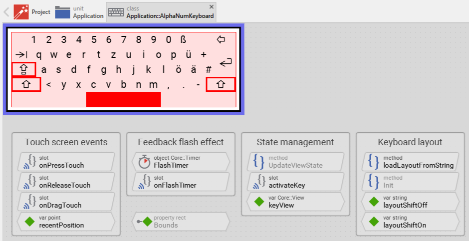 Component templates are intended to create widgets which can be adapted and enhanced to your particular design expectations. For this purpose, once you have added a new Alphanumeric Keyboard component to your project, you can open the component class for editing. Thereupon the implementation of the component appears in a new Composer page: