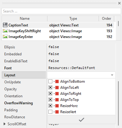 To control the adjustment you have to explicitly configure for each view its Layout property (see also Configure component layout). Let's assume, in order to display a caption text you have added a Text view to the Alphanumeric Keyboard. Then you have arranged the view within the Canvas area according to your design expectation. If you want that the view remains aligned at the top edge filling the width of the component when it is resized, you configure its Layout property as shown below: