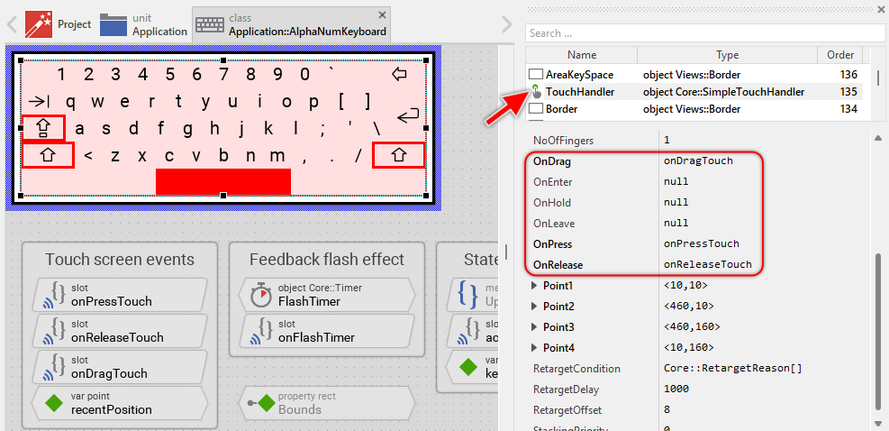 The Alphanumeric Keyboard is an interactive component that responds to touch and mouse inputs. For this purpose the template contains the Simple Touch Handler object named TouchHandler. The touch handler covers the entire keyboard area where keys are located. To this handler are associated three slot methods: onPressTouch, onReleaseTouch and onDragTouch. As their names imply the methods are invoked at the beginning of the interaction (press), at its end (release) and repeatedly while then user drags the finger (mouse pointer) inside the handler's area: