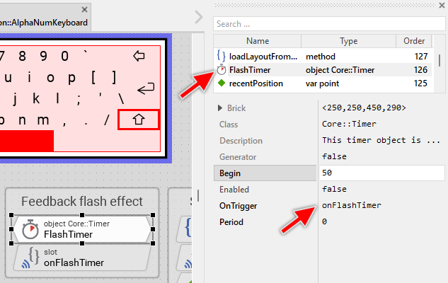 The Alphanumeric Keyboard provides visual feedback when keys are pressed. For longer key presses, the feedback is immediate - the key appearance changes while the user holds it. However, for very quick taps (shorter than 50ms), the key press and release happen so fast that the user might not see any feedback. To solve this, the keyboard uses a flash effect timer. The flash effect is implemented using the Core::Timer object named FlashTimer. The timer prolongates thereupon the visual effect. As soon as the timer expires, it signals its associated slot method: onFlashTimer: