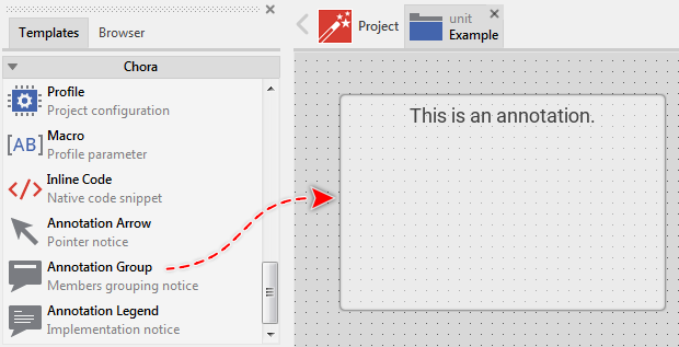With group annotations you can outline and label several project members. As such the annotations are very useful for foreigner developers to understand the structure of your implementation. Group annotation members appear in Composer as text boxes: