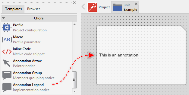 With legend annotations you can add comments and hints to your project. As such the annotations are very useful for foreigner developers to understand what the implementation does. Legend annotation members appear in Composer as text boxes with a chamfered top-right corner: