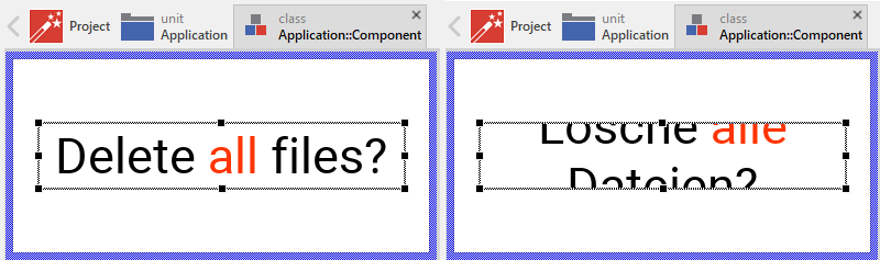 In both cases, knowing which Attributed Text view and text are affected by the clipping can be helpful, especially, when your application is intended to support multiple languages. Strings existing in such application are localized and available in multiple copies, one version for each language. The same text message may therefore occupy different amount of space depending on its translation in the particular language. A text in language English, for example, may appear without problems while the same messages translated in German may occupy too much space and appear clipped. The situation is even more complex with Attributed Text views since the formatted text can contain embedded images and use different fonts within the same text block, all of which can affect the final text layout. The following figures demonstrate the problem: