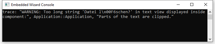 To ensure that all text contents are displayed correctly in all languages, it is therefore essential to test your application intensively. It is up to you to perform the necessary tests. However, in order to assist you in this task, the Attributed Text view provides a property OverflowWarning. Configuring this property with the value true causes the affected view to report runtime warnings if the Attributed Text view is not able to display the assigned text without clipping. In the target system the warnings appear on the console of your device, for example in the Windows console when running the application on a Microsoft Windows OS: