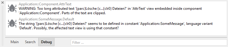The warning includes the affected text (or at least the beginning of it) and the GUI component containing the Attributed Text view. Based on this information you can review your project or the translated strings and make necessary adjustments. More comfortable and informative are the warnings collected during Prototyping. The warnings appear in Debug area of the Log window: