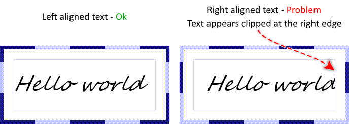 You should remind, that the text alignment does depend on the metric information provided by the original designer of the selected TrueType fonts. Especially italic fonts designed to appear slanted may cause problems with the last glyph in a right aligned row. Such glyph may appear clipped. The following figure demonstrates the problem (the thin blue borders indicate the areas of the Attributed Text views):