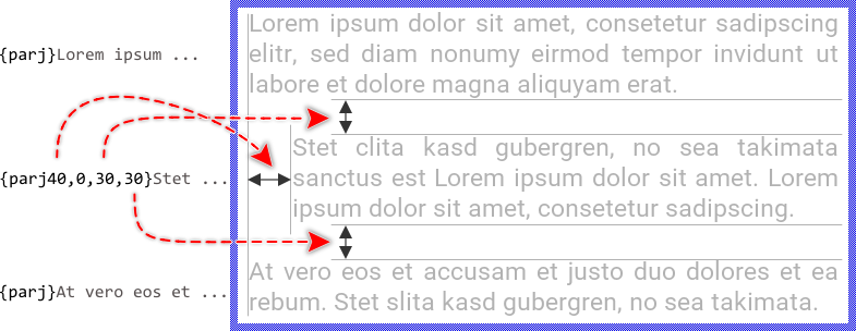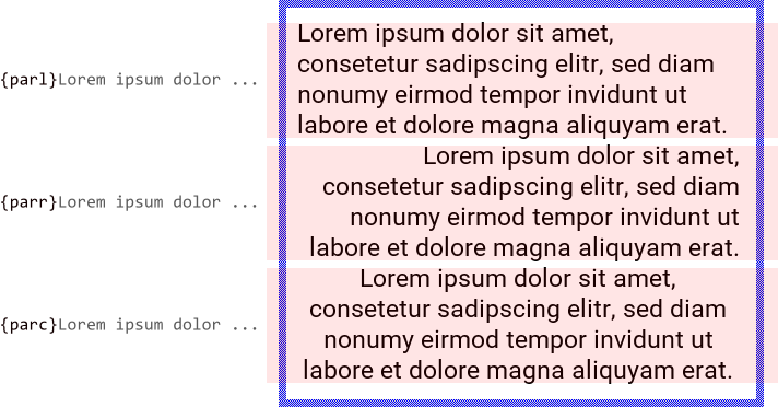Per default, the text rows belonging to a paragraph are left aligned. By using the {parr} version of the attribute (with an additional r in its name) the rows will appear right aligned. Accordingly, the attribute version {parc} centers the rows horizontally. In fact, the above described attribute {par} exists just for your convenience as an alias for the {parl} version (with l in its name standing for left). The both are thus equivalent. The following figure demonstrates the alignment effect depending on the used version of the {par} attribute:
