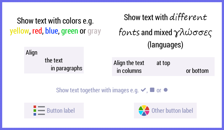 The Mosaic class Views::AttrText implements a graphical object specialized to display text enriched with attributes to control the text output. Similarly to HTML these attributes determine the alignment, the colors and fonts to print the text. Additionally the text can be combined with images and hyperlinks can be defined. This so-called Attributed Text view can be used to compose the appearance of a GUI component, in particular to display help pages and other formatted text information like button captions, etc. The following screenshot demonstrates few examples of how Attributed Text views appear in the canvas area of Composer (and accordingly on the screen in your target device):