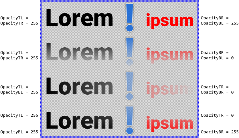 Please note, before the version 11.00 the common property Opacity and the individual properties OpacityTL.. OpacityBR were intended to be used exclusively. You could specify either the common opacity for the entire text or individual opacity for its four corners. Using both approaches simultaneously produced unexpected results depending on the order in which the properties were initialized. This confused the users.