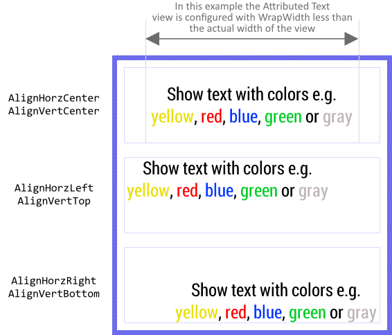 If desired, with the property Alignment you can determine other behavior. In particular, you can specify view edges at which the content should be aligned vertically. Moreover, if the Attributed Text view is configured with WrapWith less than its actual width you can additionally control the horizontal alignment of the resulting content. The following figure demonstrates few examples of how the initialization of the property Alignment affects the Attributed Text view (the thin blue borders indicate the areas of the respective views):