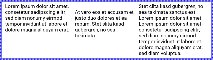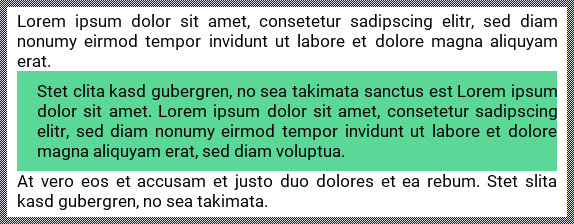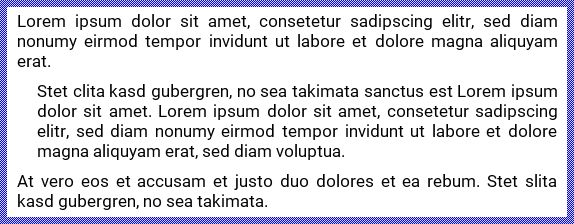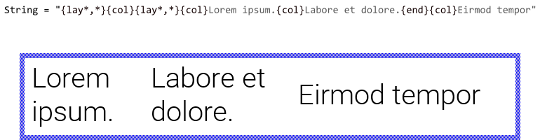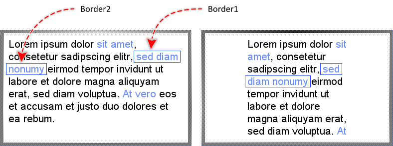 The following figure demonstrates the effect of the above described special characters to automatically wrap the words. As you see, enriching the text with ~ and ^ characters allows the Attributed Text view to automatically determine the ideal positions for the syllabication depending on the available space (indicated by the thin blue borders):