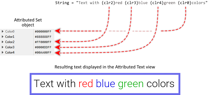If there is no {clr#} attribute specified at the begin of the text, the Attributed Text view assumes per default the color number 0 (zero). This is demonstrated in the above figure with the initial text fragment Text with, which is not prefixed by any {clr#} attributes. If the attribute refers to a color value not available in the Attributed Set object, the transparent color #00000000 is used causing the affected text span to become invisible.