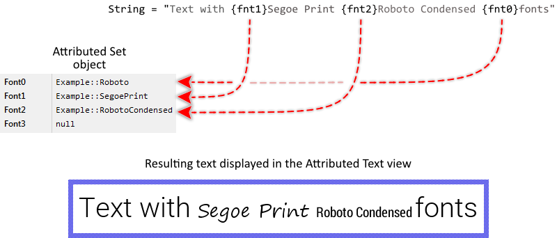 The Attributed Set is a container object where you store fonts to use by an Attributed Text view. Every Attributed Set can manage up to 256 different fonts identified by the corresponding index numbers 0 .. 255. The simplest way to specify the desired font is to use the convenience properties Font0 .. Font3. Usually, you initialize these properties with the names of existing font resource members. This approach, however, is limited to 4 entries.