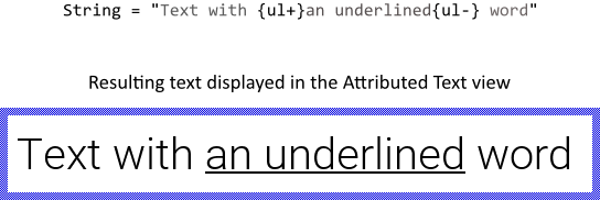 With the attribute {ul+} you specify the immediately following text to be displayed underlined until the counterpart attribute {ul-} is found. As such it is useful to emphasize important fragments within the text. The following figure demonstrates the relation between the attributes in the original text and the resulting text displayed on the screen: