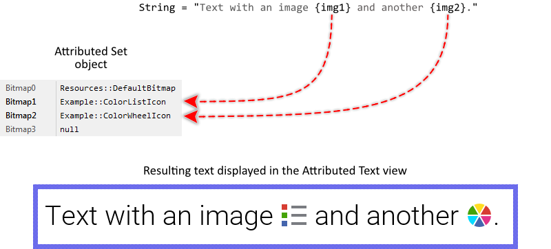 The Attributed Set is a container object where you store bitmaps (the images) to use by an Attributed Text view. Every Attributed Set can manage up to 256 different bitmaps identified by the corresponding index numbers 0 .. 255. The simplest way to specify the desired bitmap is to use the convenience properties Bitmap0 .. Bitmap9. Usually, you initialize these properties with the names of existing bitmap resource members. This approach, however, is limited to 10 entries.