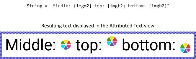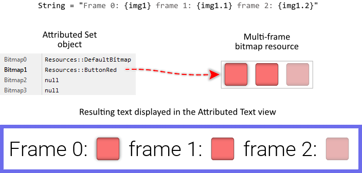 Please note, if the {img#} attribute refers to a bitmap not available in the Attributed Set object, the bitmap with the number 0 (zero) is used automatically. Similarly referring to a not available bitmap frame results in the frame number 0 (zero) being displayed implicitly.
