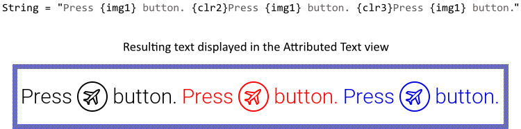 Thus if you refer an alpha-only bitmap in the Attributed Text view, the bitmap is displayed with the color specified in the latest preceding {clr#} attribute. In other words, the alpha-only bitmaps appear with exact the same color as the surrounding text. The following example demonstrates it (It is assumed, that the associated Attributed Set stores at its position 1 an alpha-only bitmap - an airplane icon for example):