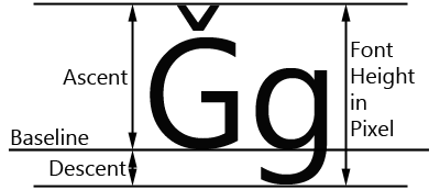 Please note, that within a single text row all text fragments are aligned on a common baseline even if the fragments are formatted with different fonts. The baseline as well as the height of the row are calculated from the largest ascent and largest descent metrics of the fonts used in the affected text row. The following figure demonstrates the relation between the font height and its ascent and descent metrics: