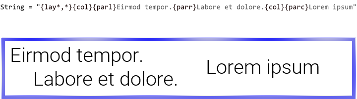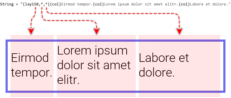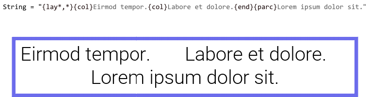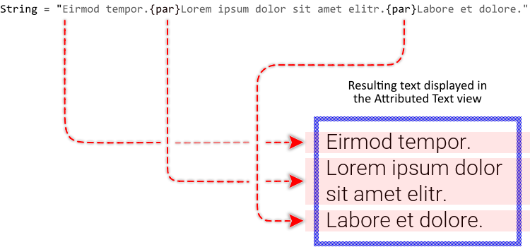With the attribute {par} you initiate a new text paragraph. Paragraphs are a convenient feature to separate the text in independent blocks, which are then displayed one below the other. If there is no {par} attribute specified, the text is implicitly considered as belonging to a single paragraph. The following figure demonstrates the relation between the {par} attributes and the resulting text displayed on the screen (the paragraph areas are highlighted reddish in the resulting image):
