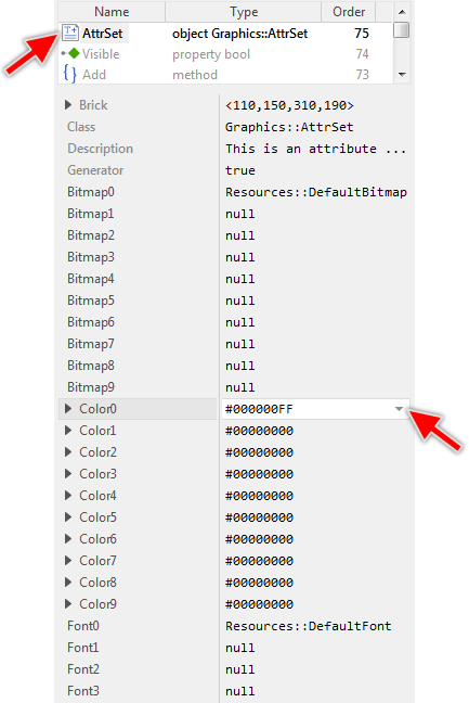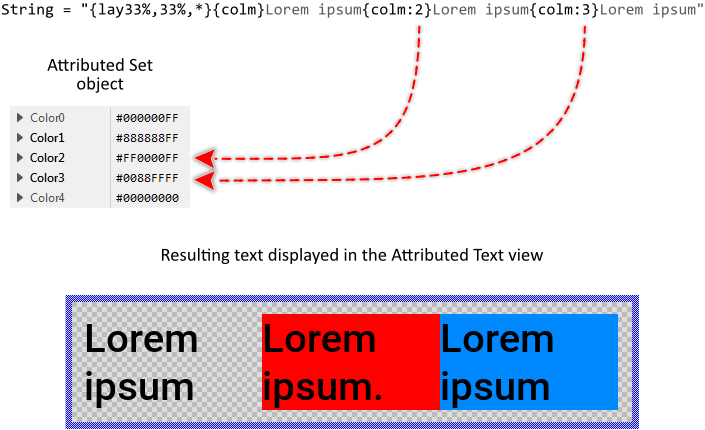 The Attributed Set is a container object where you store colors to use by an Attributed Text view. Every Attributed Set can manage up to 256 different color values identified by the corresponding index numbers 0 .. 255. The simplest way to specify the desired colors is to use the convenience properties Color0 .. Color9. All you have to do is to initialize them with the desired color values. This approach, however, is limited to 10 entries.