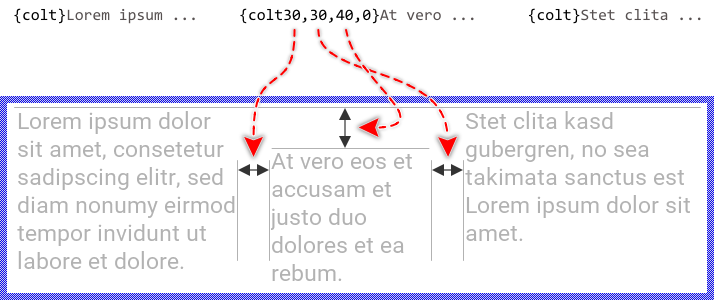 The operands for the left and right margins can alternatively be expressed in percent of the original column width. This can be achieved by simply appending the % (percent) sign at the corresponding decimal number. For example, the attribute {colt10%,10%,5,5} calculates for the left and the right margins with 10 % of the entire column width. The remaining 80 % are occupied by the actual content of the column. Please note, that this alternative notation is not applicable to the upper and bottom margins, which can be expressed only in pixel.
