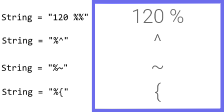 The attributes start with the special character { which permits you to enter them conveniently by using the keyboard. However, since being a special character it is not visible. In order to display the { sign, you have to prefix it explicitly by the % (percent) sign, as described in the section Specify the text.