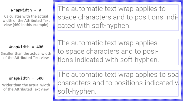 Per default, the complete text layout and thus the text wrap is calculated depending on the actual width of the Attributed Text view. Changing the size of the view will thus cause the text layout to update accordingly. With the property WrapWidth you can override this behavior and specify explicitly other width to layout the text irrespective of the actual size of the Attributed Text view. This is in particular useful, if you intend to align or scroll horizontally the resulting text block. By assigning the value 0 (zero) to the property WrapWidth the Attributed Text view restores again its default wrap behavior. For example: