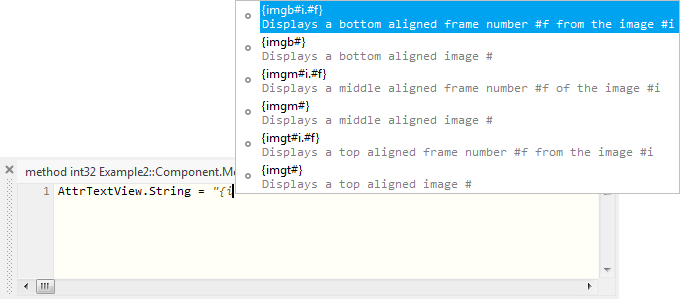 When you enter a string literal in the Code Editor, the integrated Assistant window displays a list with the available attributes as soon as you have entered the { (curly brace) sign. Thereupon you can select the desired attribute in a convenient manner. To use this feature also when editing initialization expressions in the Inspector window, you can link the Inspector to Code Editor. The following figure demonstrates the mentioned Assistant while entering some string literal in the Code Editor: