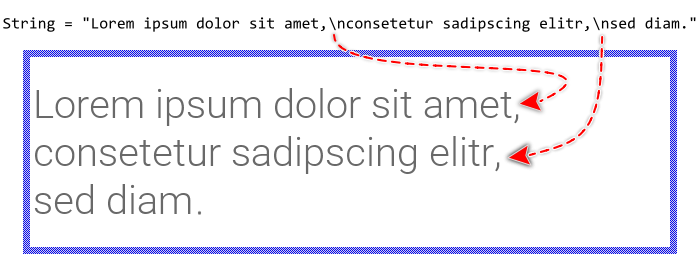 If the specified text contains \n (new-line) characters, the text portions lying in-between are treated and displayed as individual text rows. In other words, if you intend to display a multiline text block, you separate the rows simply by \n (new-line) characters. The \n (new-line) character itself is not visible in the resulting text: