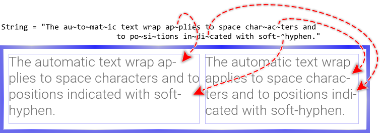 The signs ~ (tilde) are treated as soft-hyphens. They determine potential candidates to wrap a word. These signs are not displayed until the text wrap took place at their position. In such case the affected text row is terminated with an additional hyphen - sign indicating that the word has been broken there. |