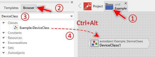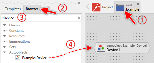 Autoobject members have a global character - they can be accessed from everywhere within your project. To address an autoobject member, you must always use its full name, which is composed of the unit name, the member is defined inside, and the name of the member itself, both separated by :: (double colon) signs. For example Examples::Device.