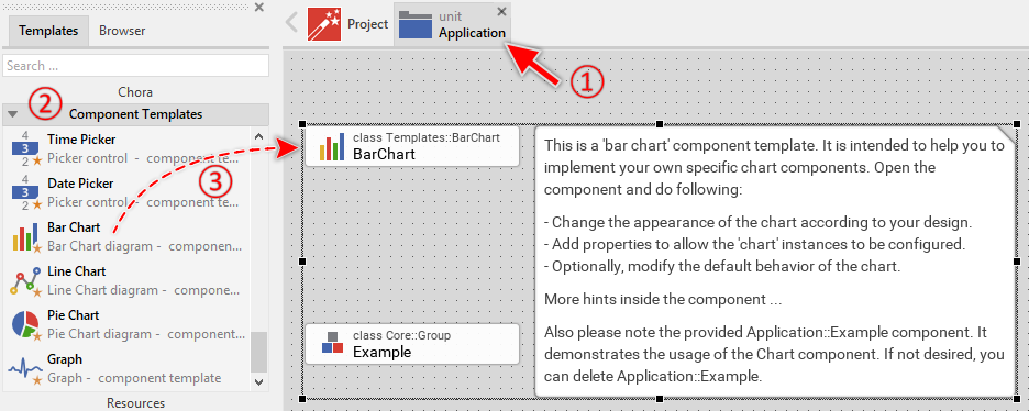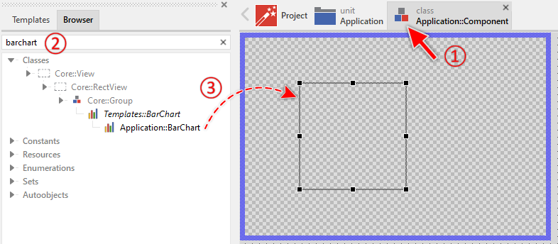 To create a new Bar Chart component from a template you simply Drag & Drop it between the Templates window and the Composer with an opened unit. This is important in that by using the component templates you add in fact a new class to your project. Classes, in turn, can exist within units only. The following are the typical steps to create a new Bar Chart component from a template: