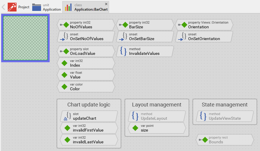Once you have created the Bar Chart component, you can use it to assemble more complex components. Technically seen, you embed an instance of the Bar Chart class in-place within some superior GUI component. At the runtime, the superior GUI component takes care of the correct initialization and the displaying of all embedded components, so they appear similarly as you have composed them at the design time.