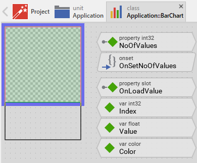 The property OnLoadValue should refer to a slot method, which will be invoked by the chart component in order to load the data for a given bar. The slot method receives no parameters. Instead, within the slot method implementation you access the Index variable to identify which bar is being loaded, and set the Value and Color variables to specify the bar's data. When the referred property is modified by other widget or the application logic, the Bar Chart is automatically notified to remain in sync with the property. |
