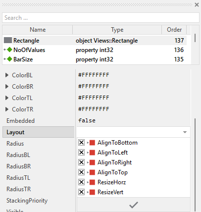 To control the adjustment you have to explicitly configure for each view its Layout property. (see also Configure component layout). Let's assume, in order to display a background decoration you have added a Rectangle view to the Bar Chart. Then you have arranged the view within the Canvas area according to your design expectation. If you want now that the view grows and shrinks according to size changes of the Bar Chart, you enable in the property Layout of this view following settings: