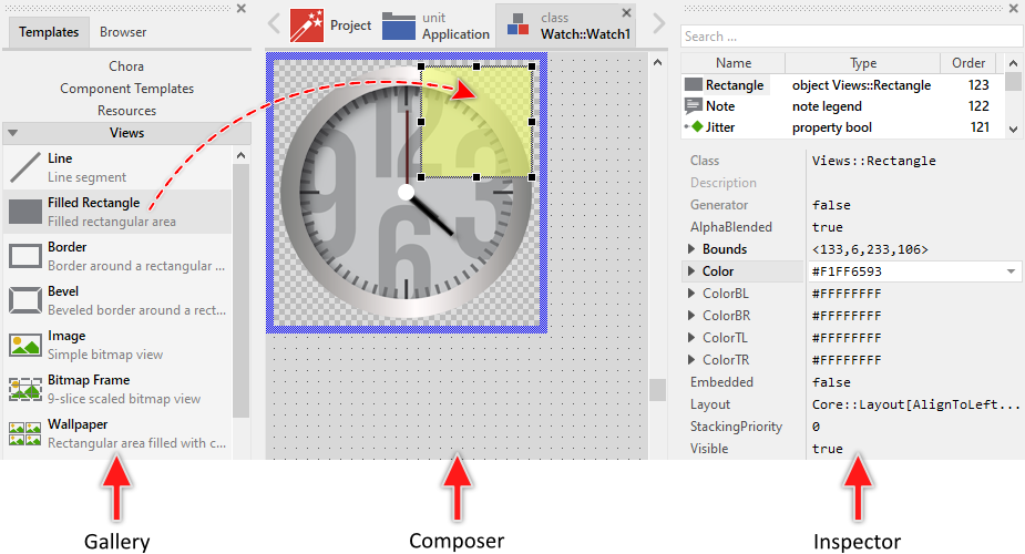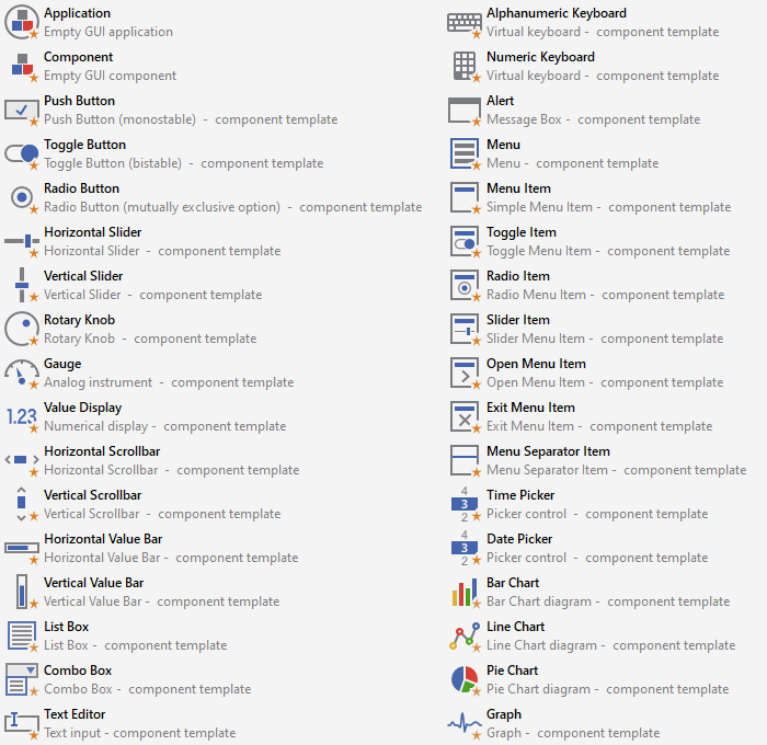 In order to simplify the development of your own GUI components, Embedded Wizard Studio provides an extensive set of pre-implemented component templates. Thus instead of creating every new component from scratch you can create it from the appropriate template. For example, if you want to create a new slider component you use the slider template for this purpose. Once created, you can edit and adapt the component according to your particular design and function expectations. Moreover you can create your own templates and reuse them later.