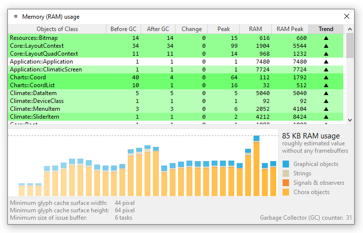 When looking at RAM usage you should also consider the amount of memory required for the frame buffer. Depending on the target system, it may be necessary to reserve memory sufficient for the entire frame buffer. Other targets, in turn, work with small so-called scratch-pad buffers to render the screen contents strip by strip. The entire RAM usage depends thus also on the mode how frame buffer is used in the concrete target system.